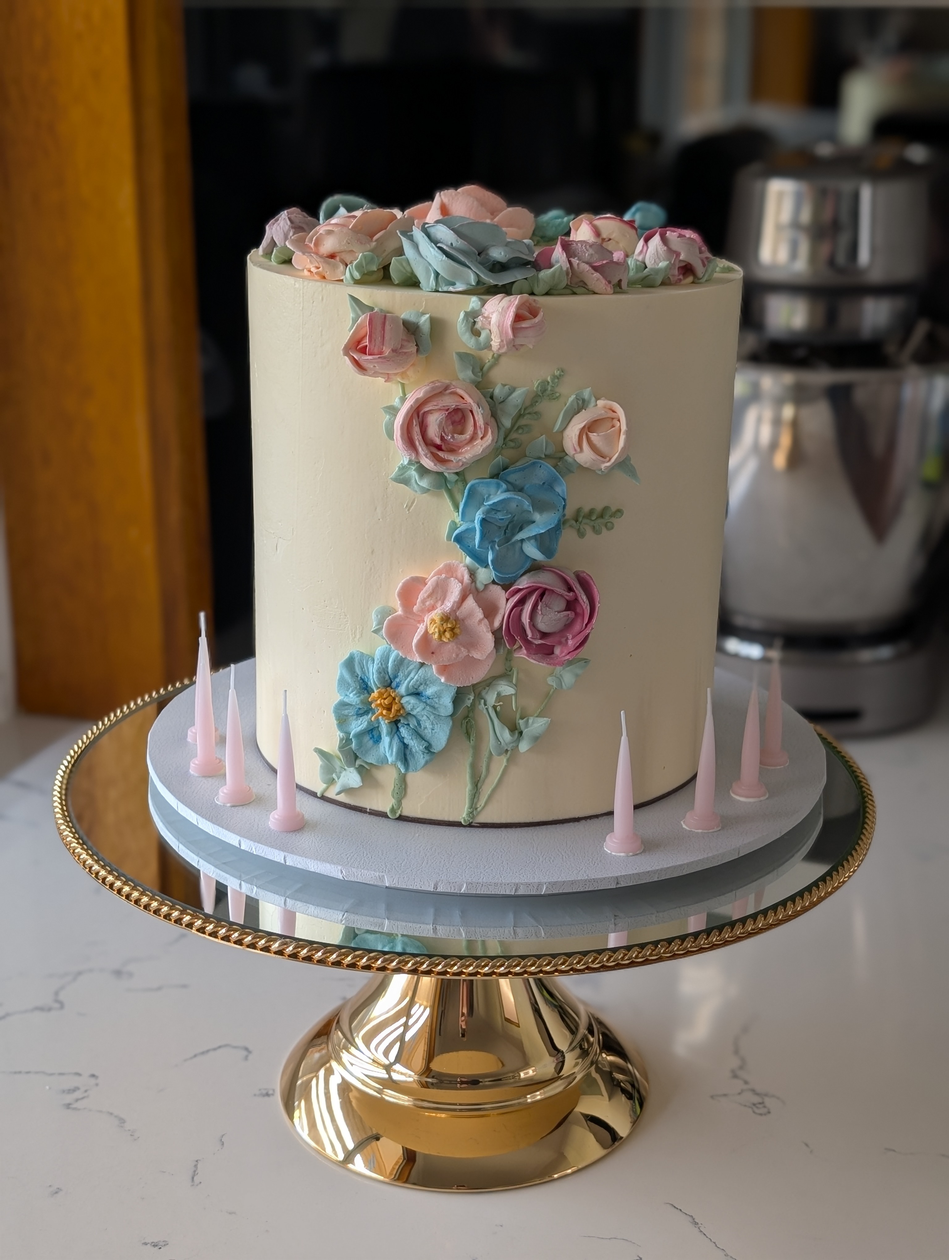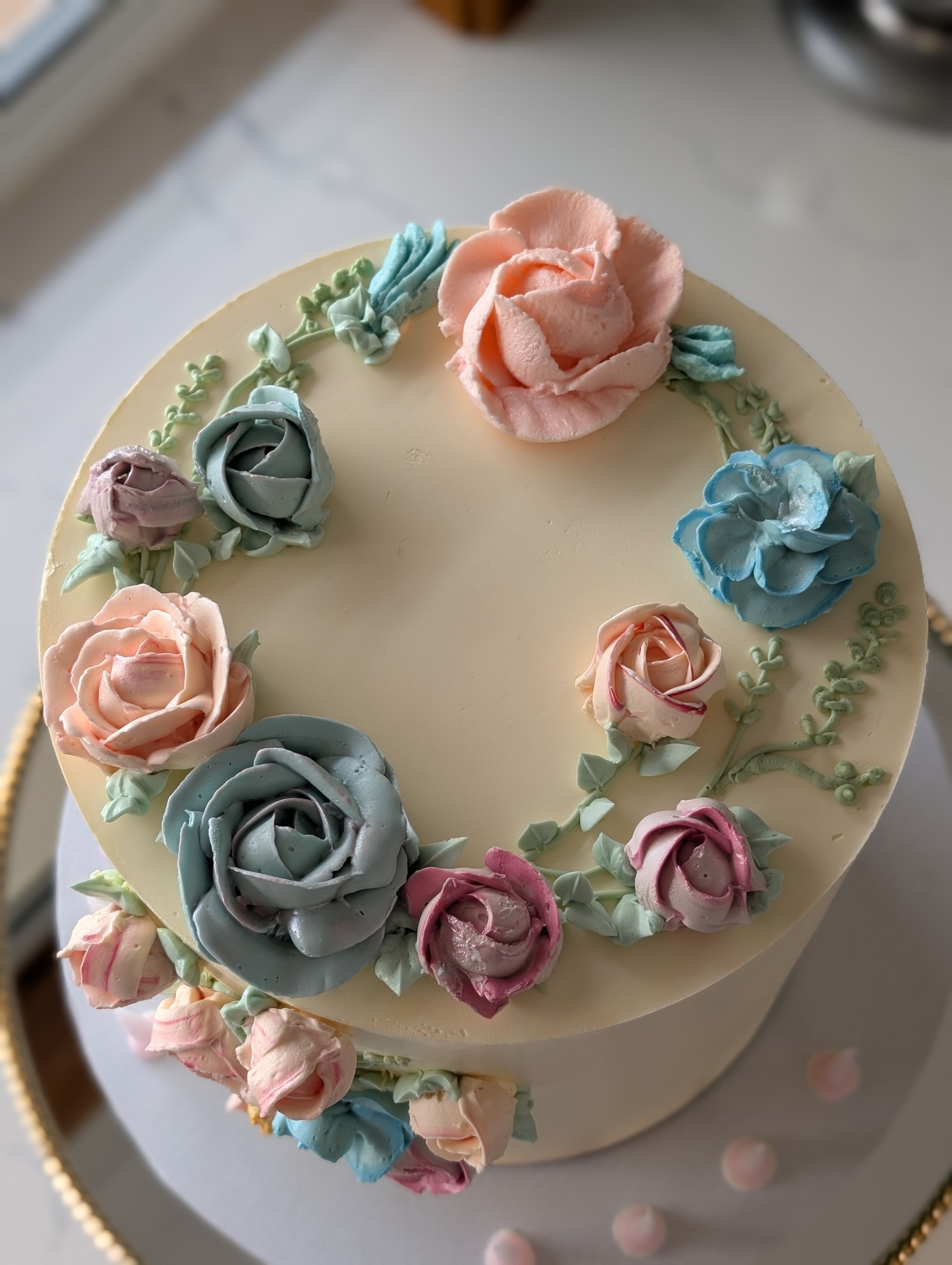 Buttercream florals on a flawless ivory buttercream.